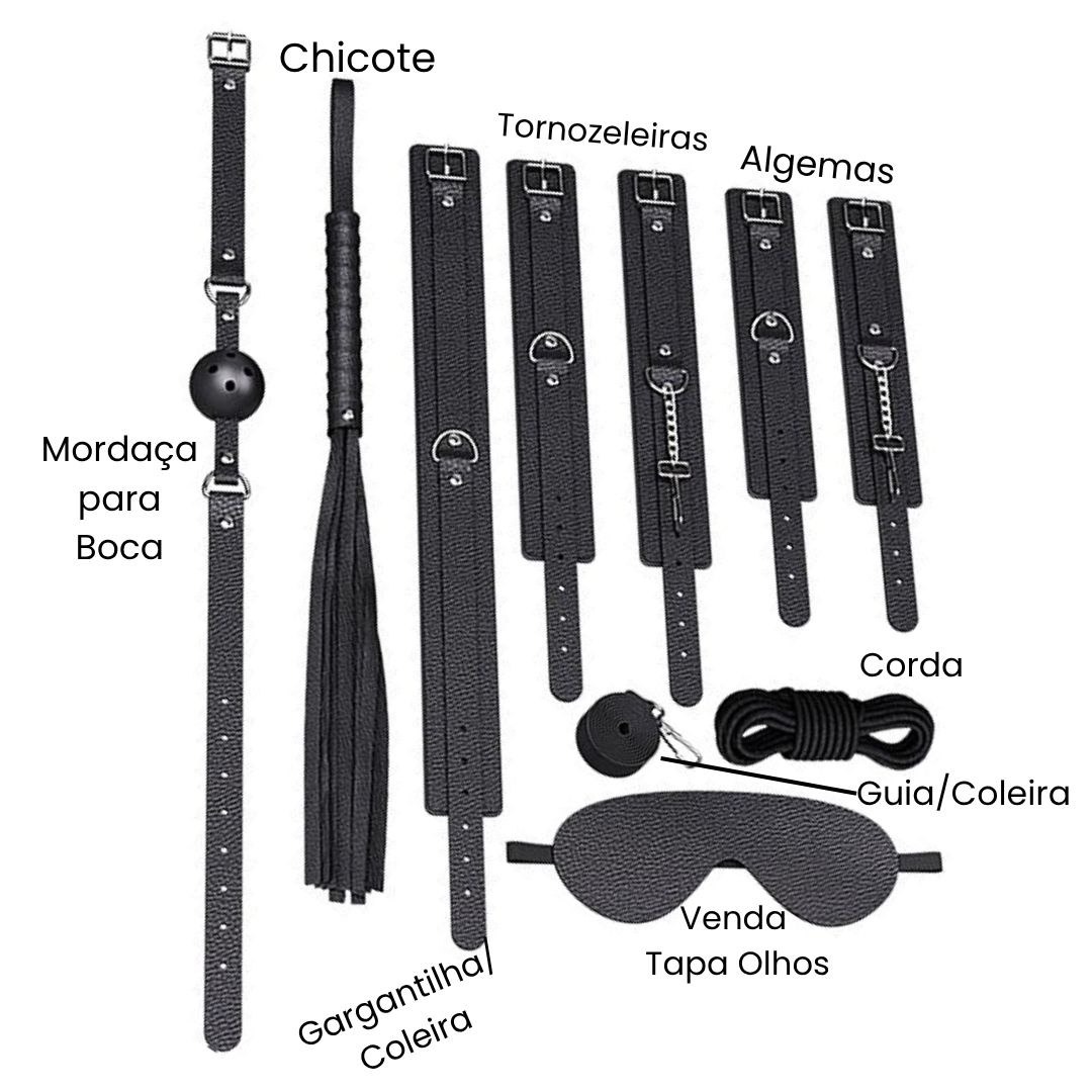 KIT SADO COMPLETO composto por venda, mordaça, algema, tornozeleira, chicote, corda, guia e coleira.